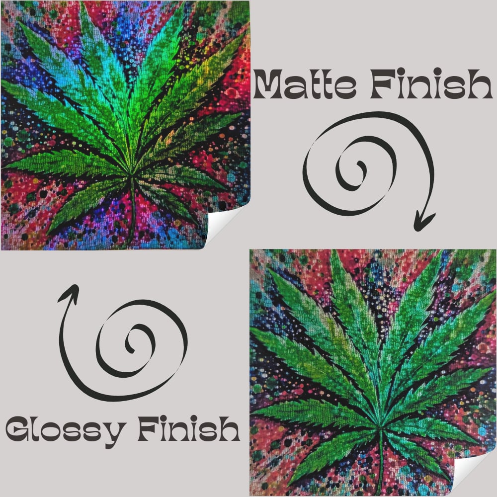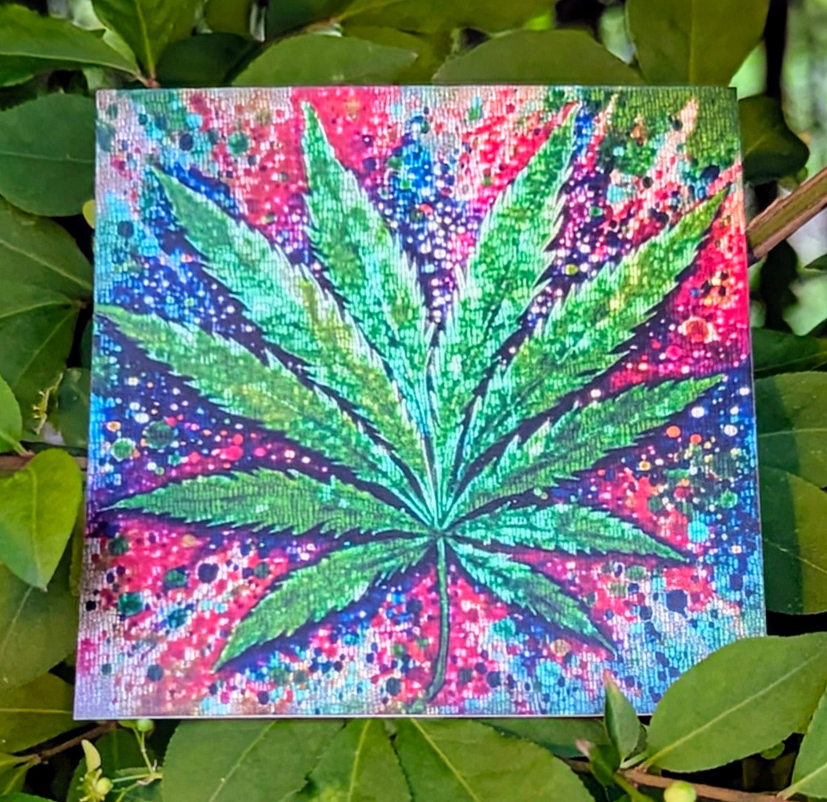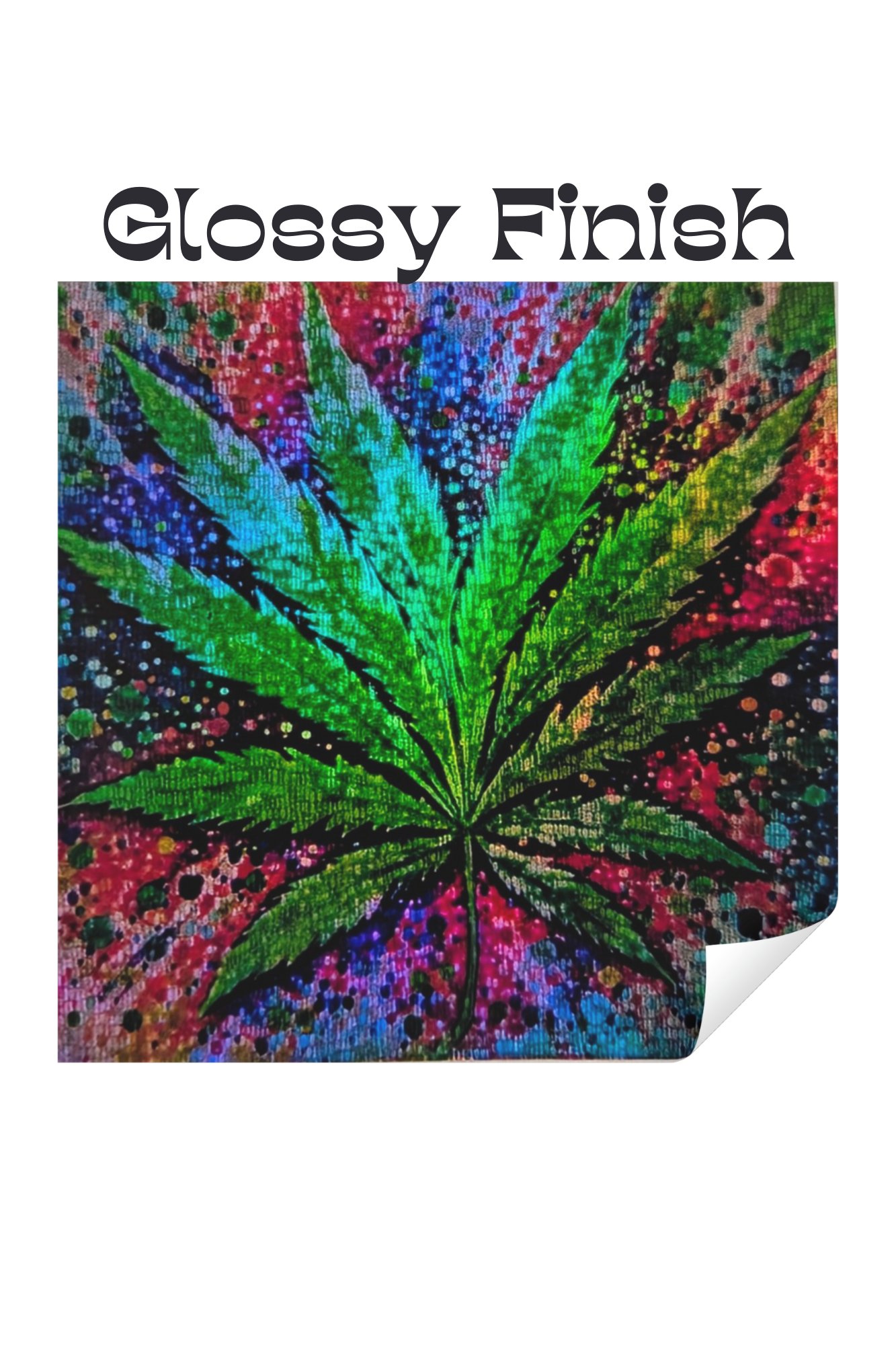 A 420 Cannabis Leaf Holographic Vinyl Sticker. This square 3 inch holographic sticker features a unique cannabis leaf binary code pattern giving it a retro 90's look. It's great for laptops, cell phones, journals, and cups. Stickers are UV sealed, and waterproof. Easy to clean with a damp cloth.